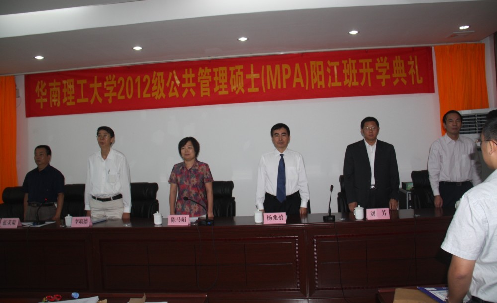 9月16日,华南理工大学2012级公共管理硕士(MPA)阳江班在市委党校举行开学典礼,市政府副市长陈马娟、华南理工大学公共管理学院和研究生院领导、教授出席典礼。华南理工大学公共管理学院党委书记、副教授杨兆禧代表学院对入学新生的学习、工作提出了要求,陈马娟副市长代表市委、市政府对入学新生寄于了殷切希望。华南理工大学今年在我市招收录取MPA新生35名,这35名学子从去年10月开始,通过紧张的复习、考试、复试等环节,从100多名考生中脱颖而出,获得了华南理工大学的录取通知书。